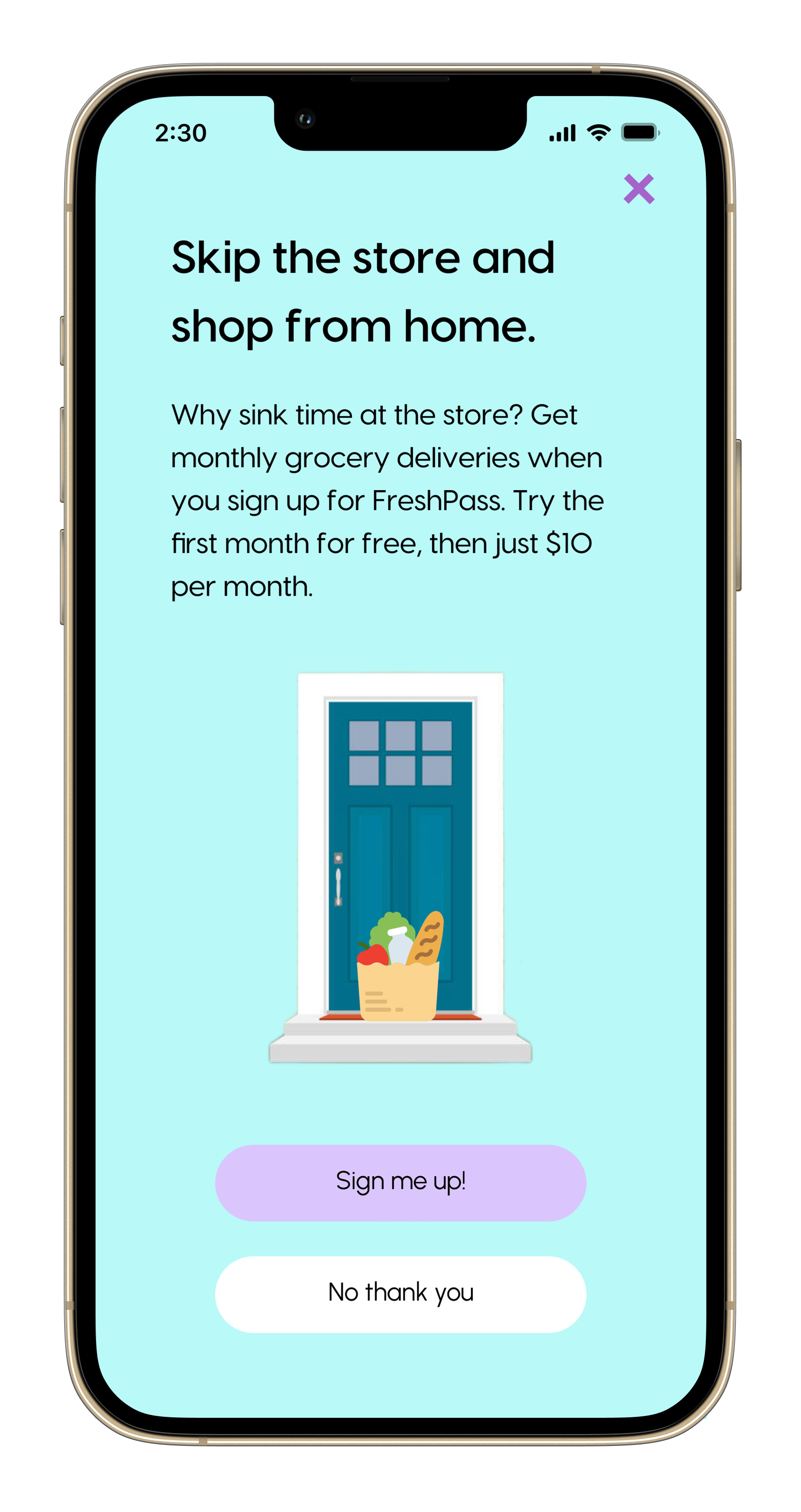 Challenge: Write a promotional home screen for a subscription service that delivers groceries to the user once-a-month for a flat fee.