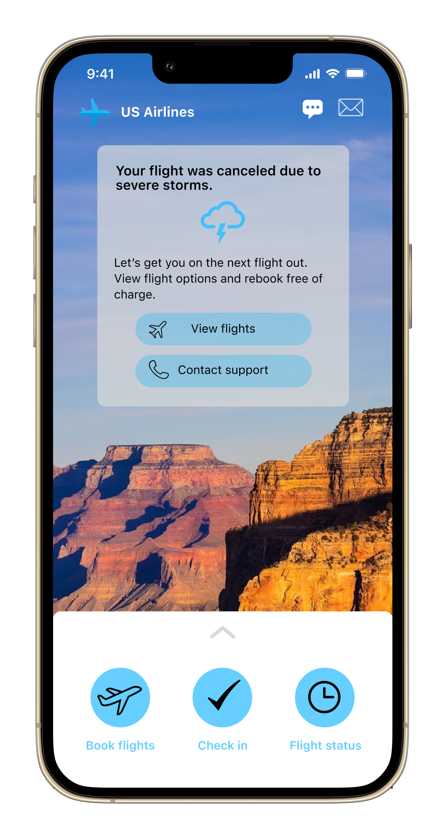 Challenge: Write a message from the airline app notifying them of the cancellation and what they need to do next.